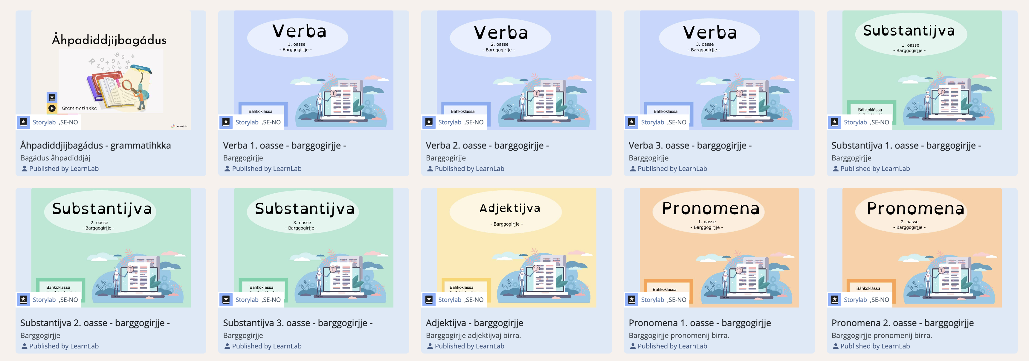 Grammatihkka l gålmå rájdduj juogeduvvam. Gávnnuji moadda hárjjidusá. Muhtem tiemájn li 1. oasse, 2. oasse ja 3. oasse. Dá li dáse tjiegŋodime hárráj. Grammatihkka – báhkoklássa le dáj báhkoklássaj birra: verba, substantijva, adjektijva, pronomena, adverba, konjunksjåvnå/subkonjunksjåvnå, postposisjåvnå, determinatijva ja possesivsuffiksa.