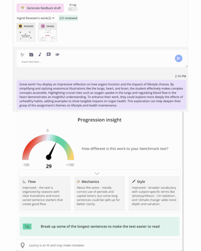 Progresjonsinnsikt hjelper deg å forstå hvordan skrivingen din utvikler seg over tid. Ved å sammenligne ditt arbeid med en referanse, gir KI tydelige indikatorer på fremgang og områder for forbedring. Den fremhever også signaler som støtter refleksjon rundt ektheten i eget arbeid – og gjør KI-gjenkjenning til en meningsfull del av læringsprosessen.